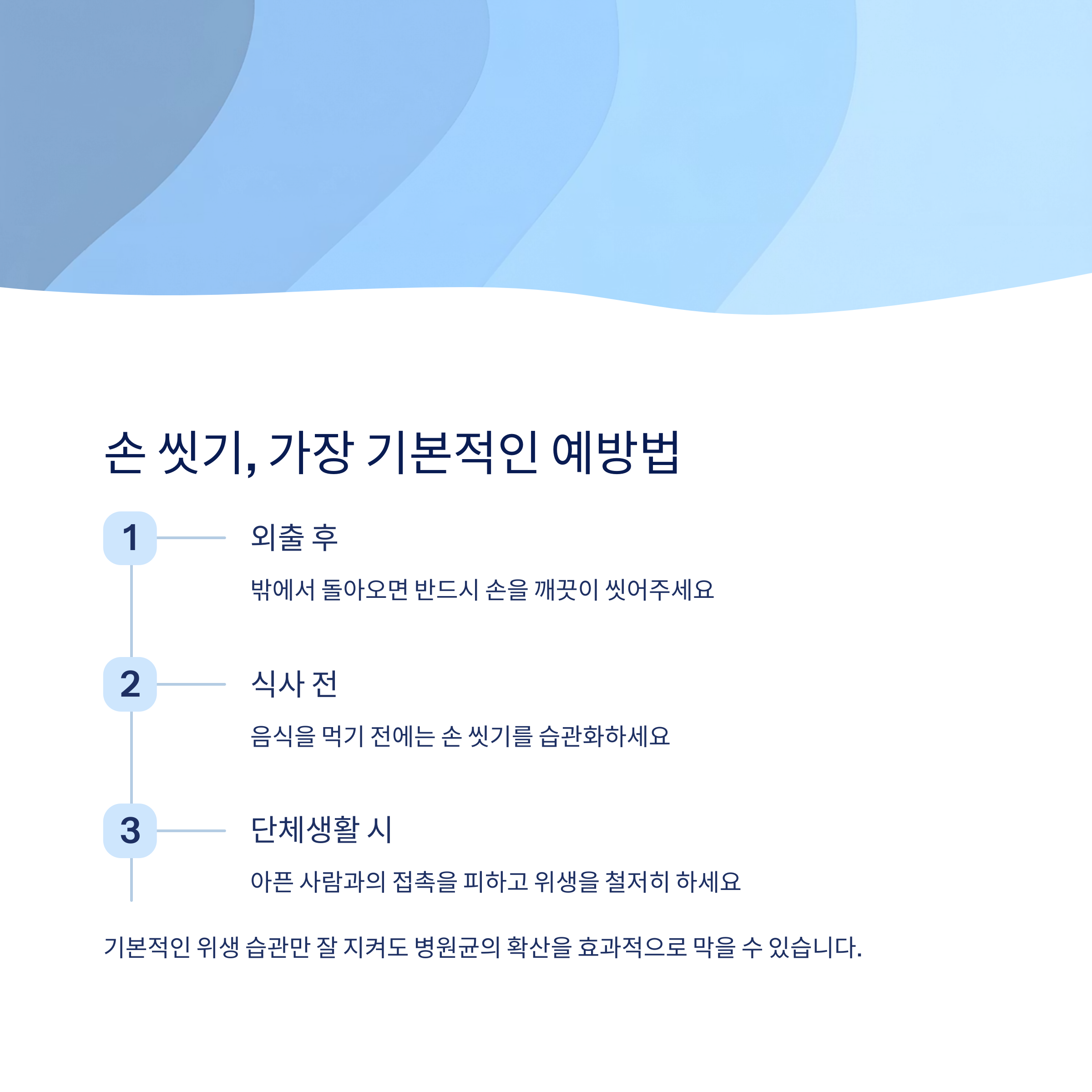 외출 후, 식사 전후, 화장실 사용 후 손 씻기는 습관화해야 합니다.