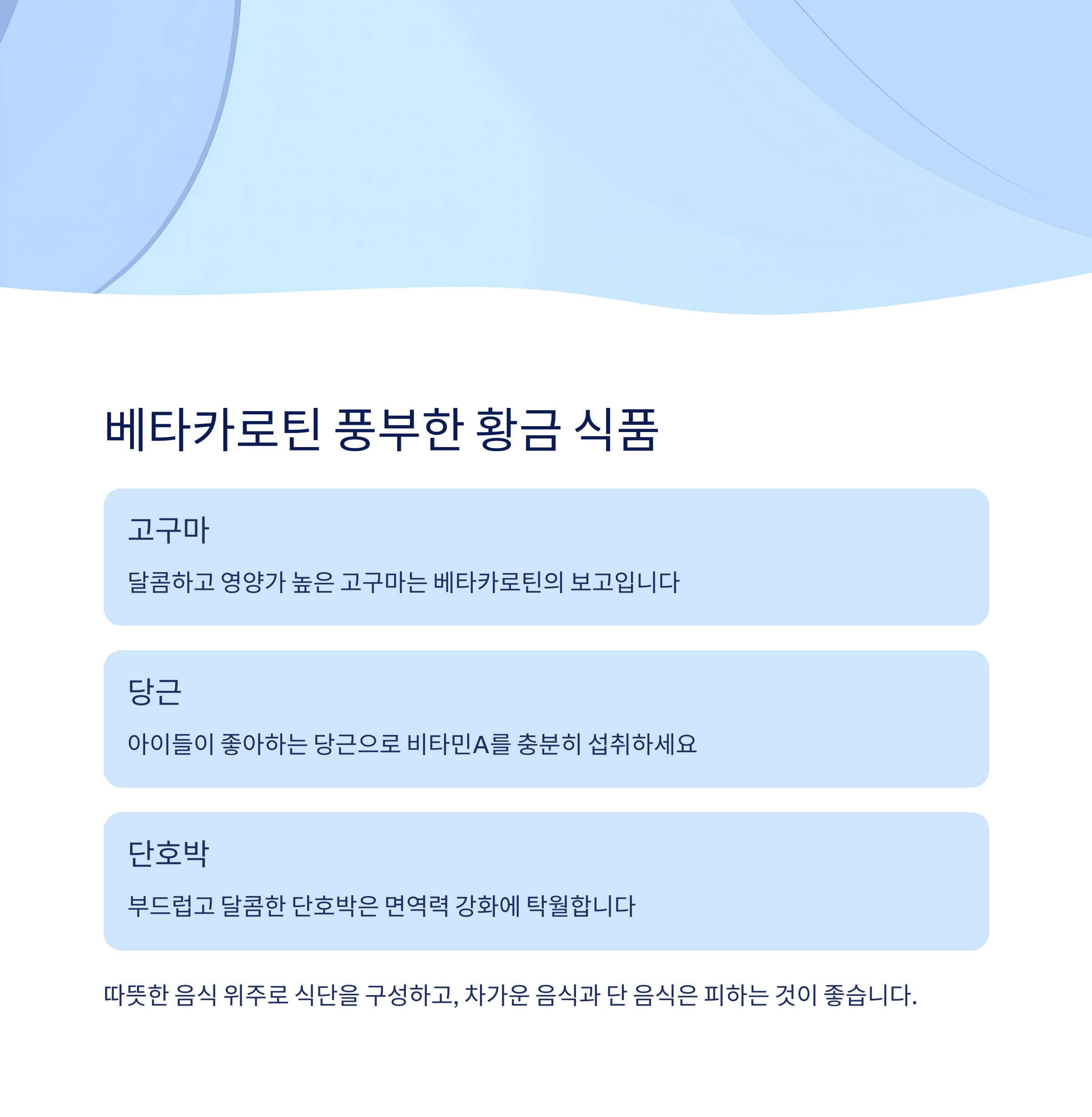 베타카로틴이 풍부한 고구마, 단호박, 당근도 자주 식탁에 올려주세요.