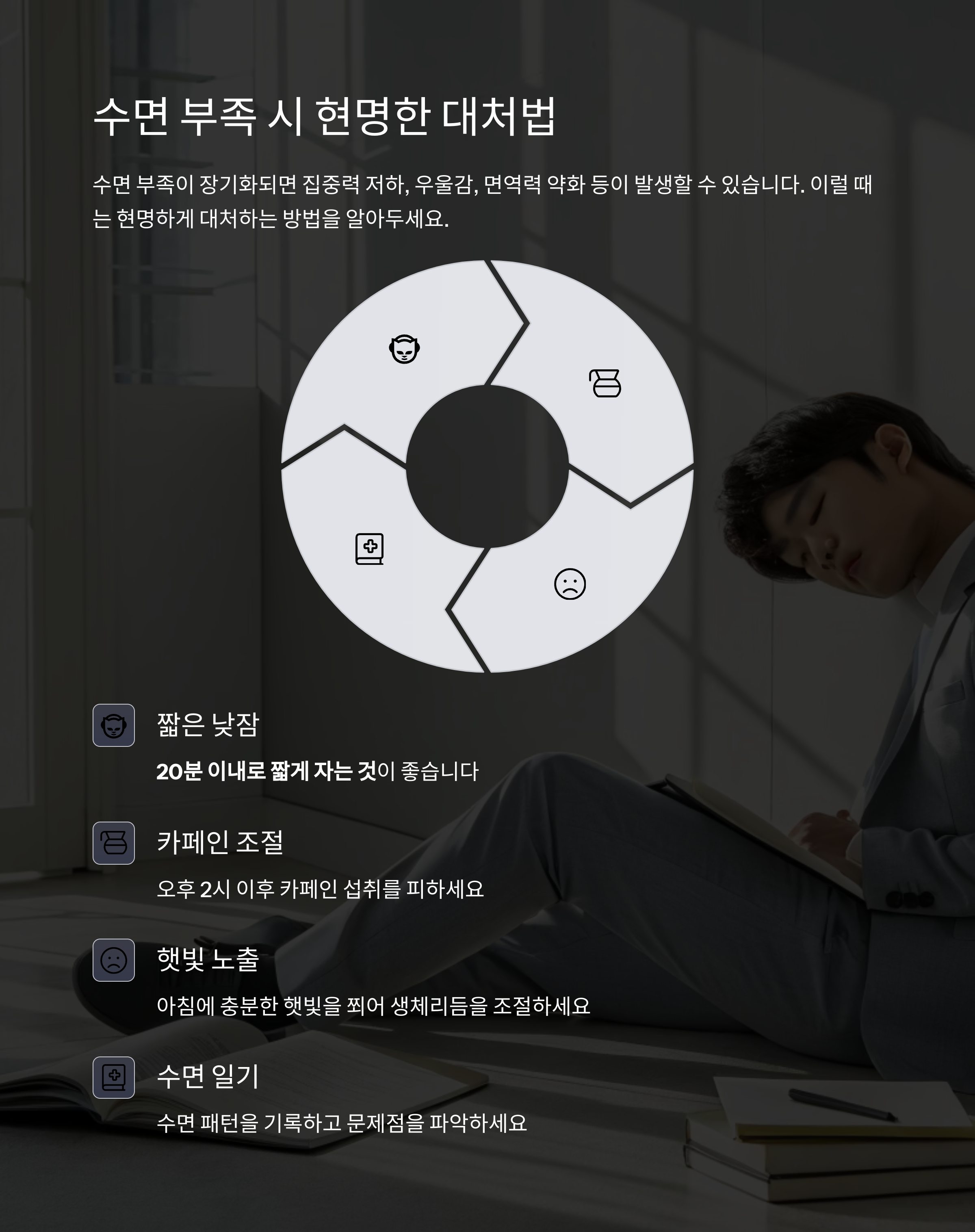 열번째, 수면 부족 시 대처법 마련도 필요하다. 수면 부족이 장기화되면 집중력 저하, 우울감, 면역력 약화 등이 발생할 수 있다. 이럴 때는 낮잠으로 피로를 보충하되, 20분 이내로 짧게 자는 것이 좋다.