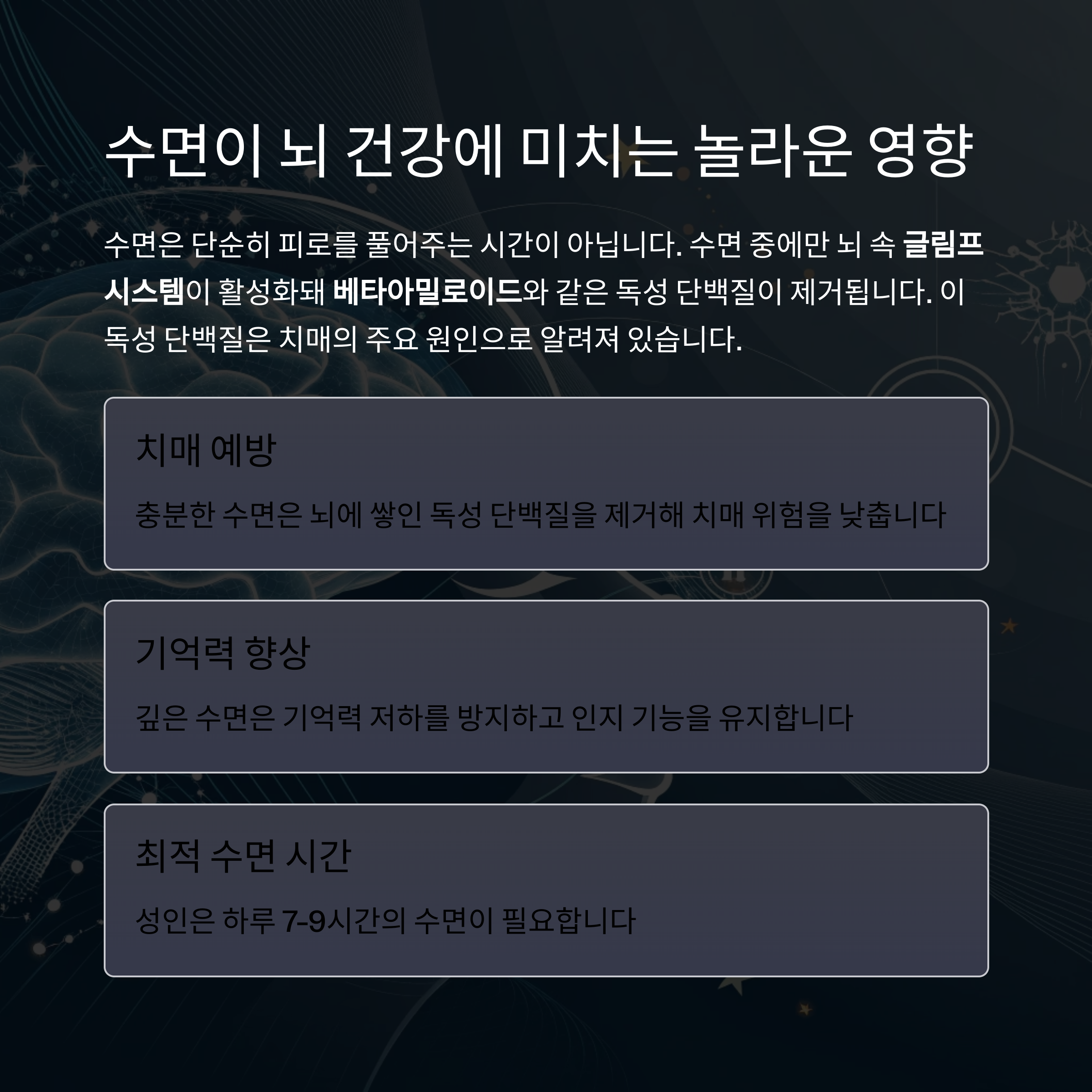 따라서, 하루 7시간 이상의 충분하고 깊은 수면은 뇌 건강을 유지하고, 기억력 저하와 치매를 예방하는 데 필수적이다.