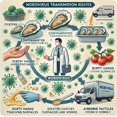 노로바이러스는 전염력이 매우 강한 바이러스로, 다음과 같은 경로를 통해 쉽게 전파됩니다: