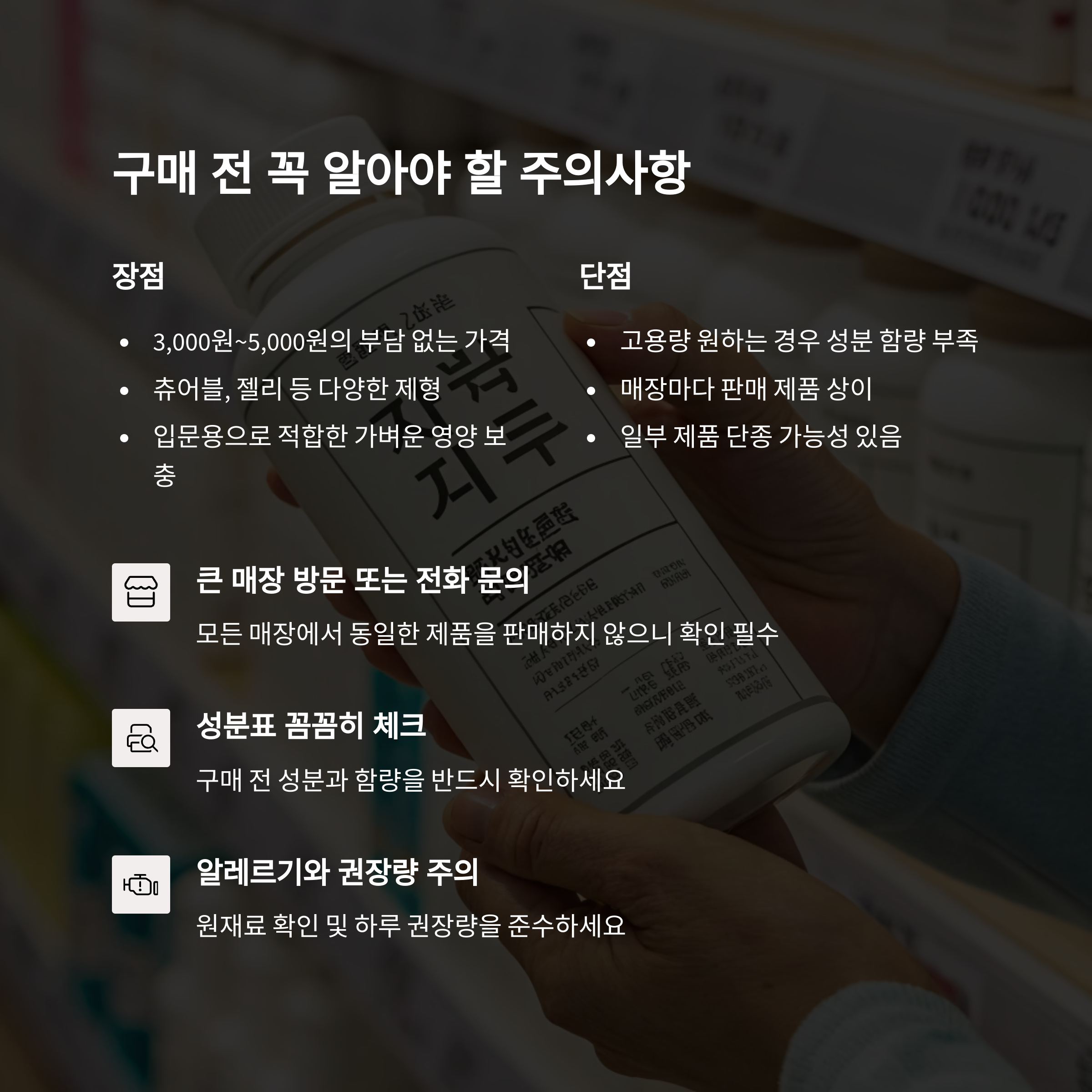 - 성분표 꼼꼼히 체크: 구매 전 성분과 함량 꼭 확인