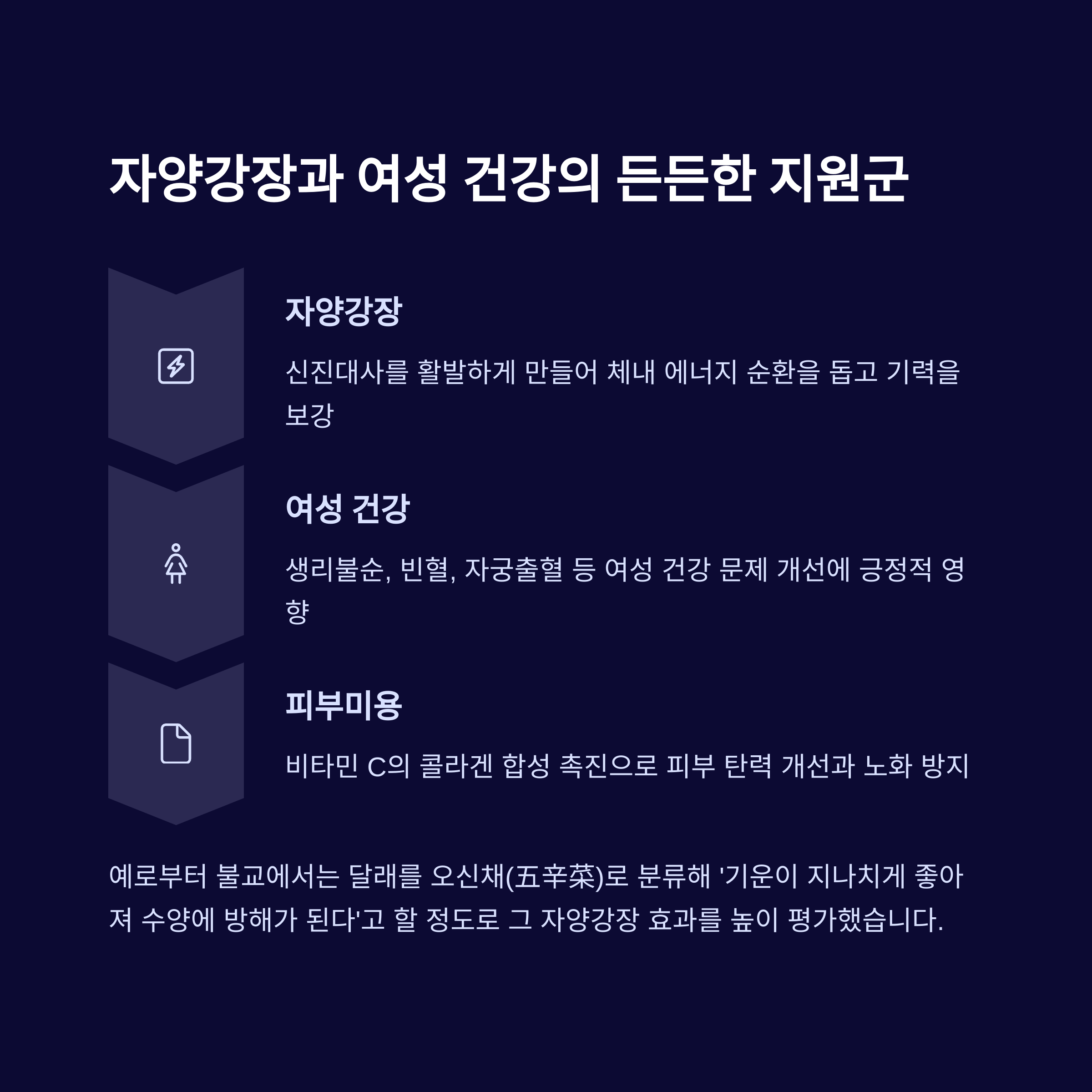달래의 알리신은 신진대사를 활발하게 만들어 체내 에너지 순환을 돕고, 기력을 보강하는 데 뛰어난 효능을 발휘합니다. 예로부터 불교에서는 달래를 오신채(五辛菜)로 분류해 '기운이 지나치게 좋아져 수양에 방해가 된다'고 할 정도로 그 자양강장 효과를 높이 평가했습니다.