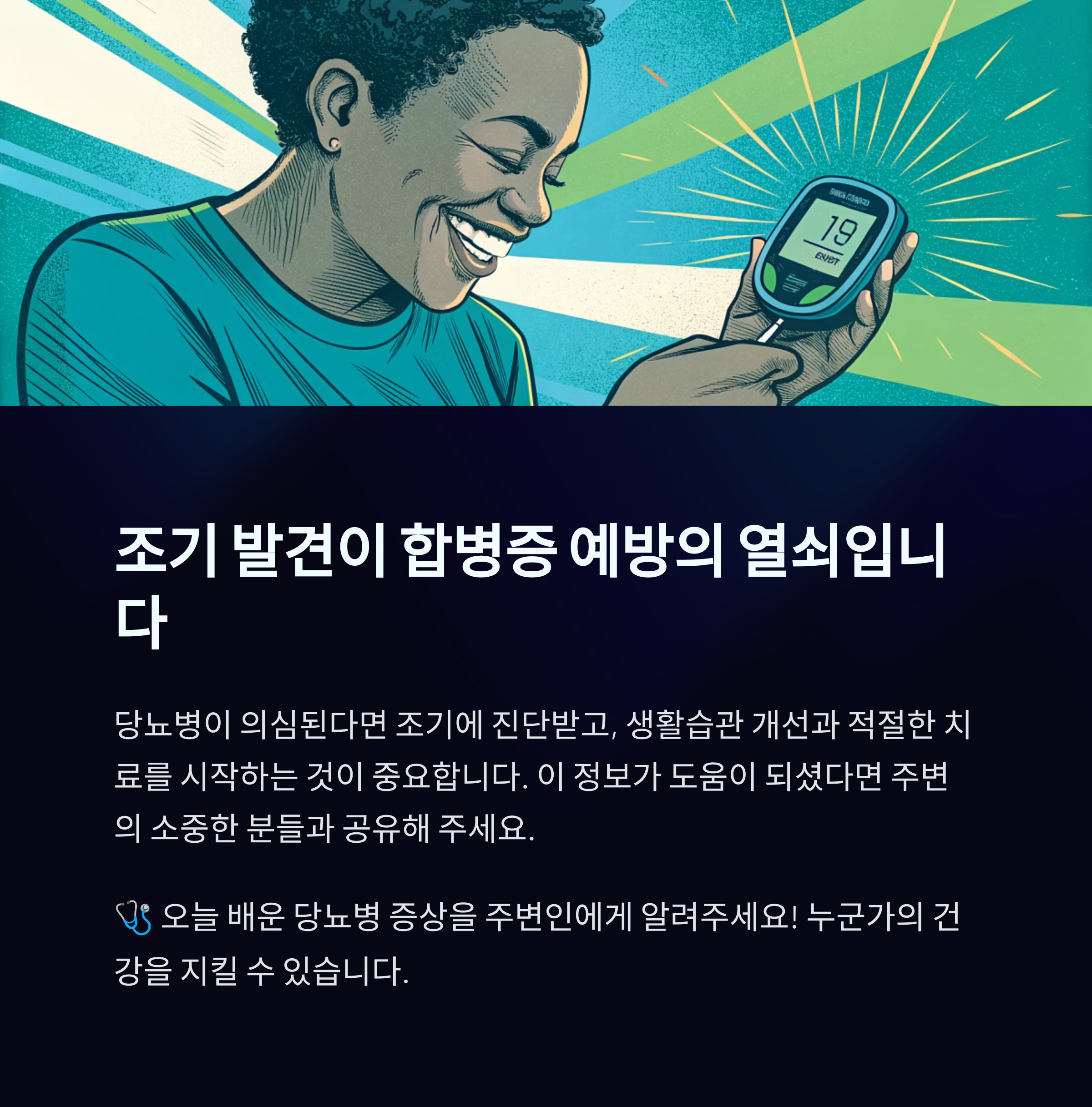필수: 조기 검진은 혈관 합병증 예방과 당뇨 관리에 있어 가장 중요한 첫 걸음입니다.