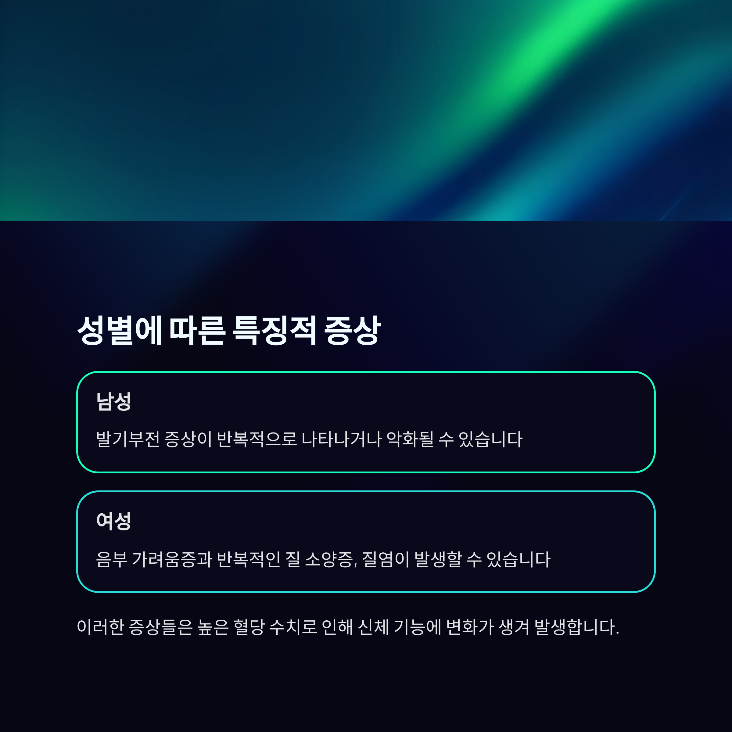남성과 여성은 호르몬과 생리 구조의 차이로 인해 당뇨 증상이 다르게 나타날 수 있습니다.