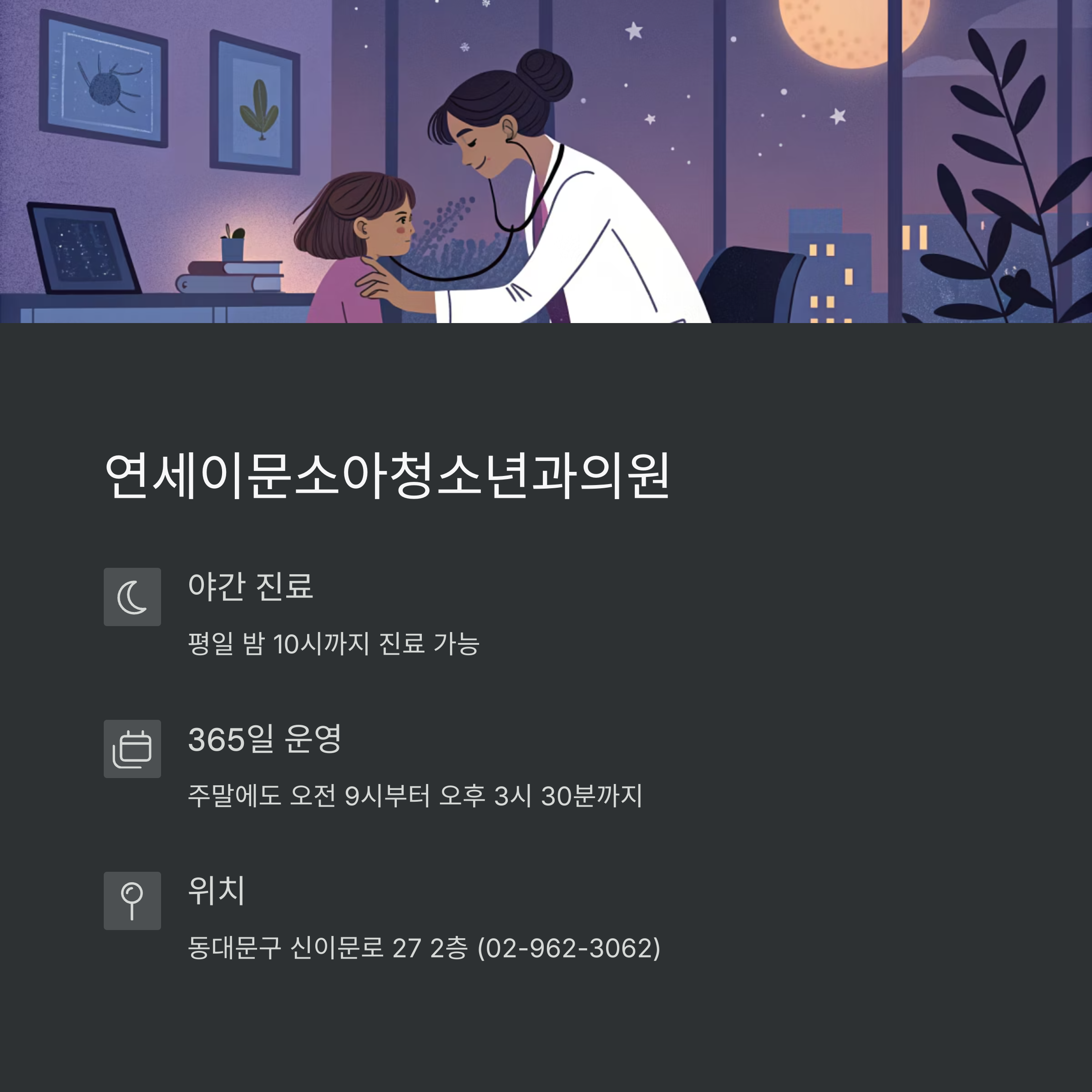 연세이문소아청소년과의원 - 야간 진료 및 365일 운영