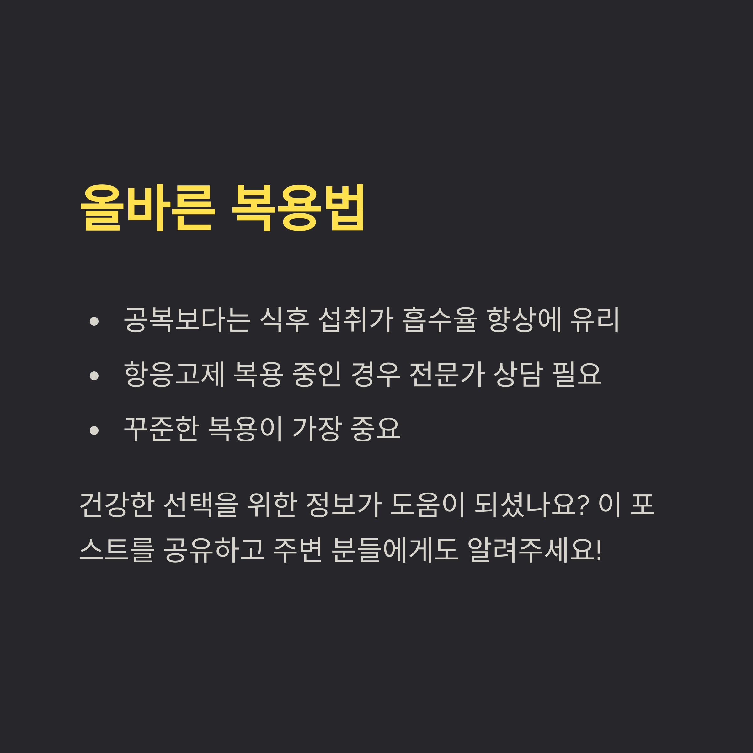 • 공복보다는 식후 섭취가 흡수율 향상에 유리합니다