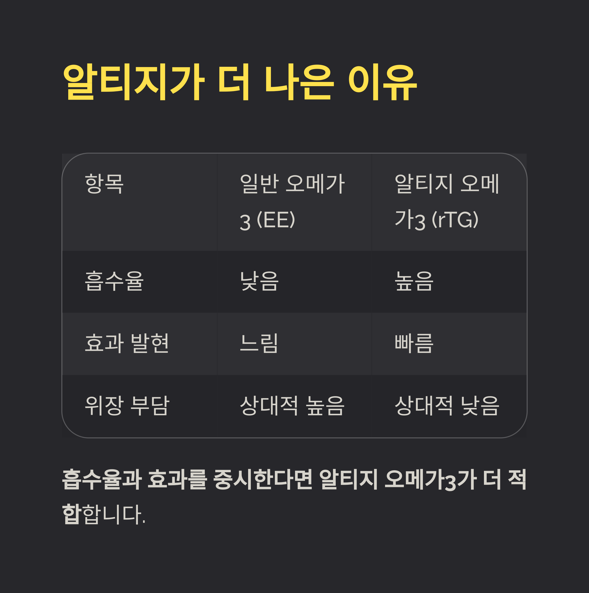 흡수율과 효과를 중시한다면 알티지 오메가3가 더 적합하다는 결론입니다