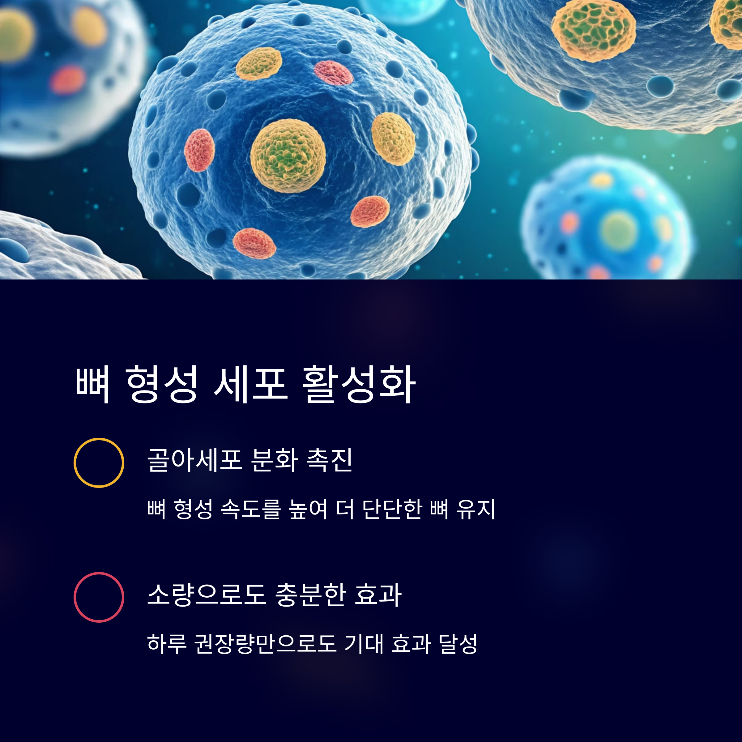 소량만 섭취해도 뼈를 구성하는 세포에 직접적으로 작용하여 골밀도 증가를 유도합니다