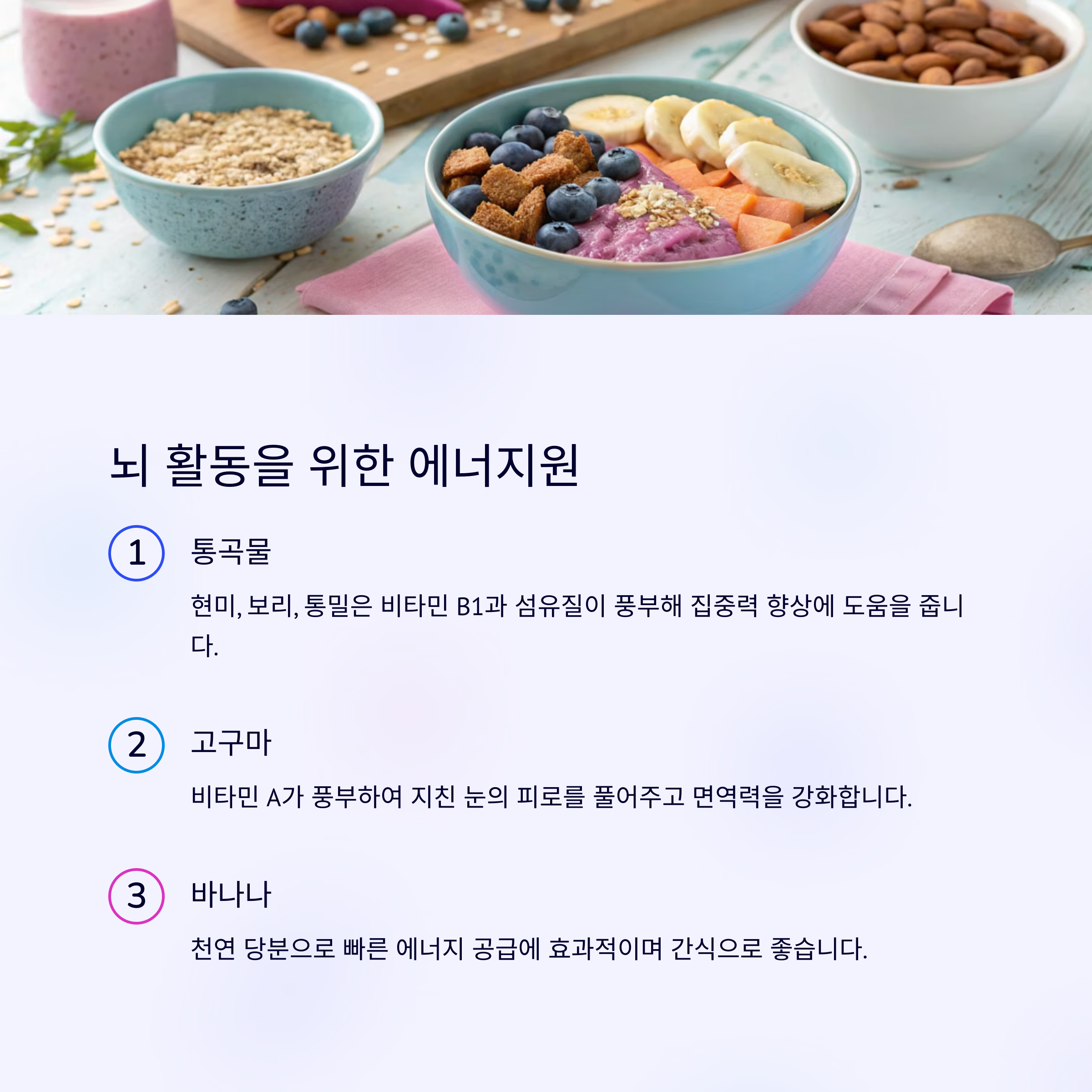 뇌는 포도당만을 에너지원으로 사용하므로, 아침 식사를 거르지 않고 규칙적으로 탄수화물을 섭취하는 것이 중요합니다. 특히 혈당을 급격히 올리지 않고 꾸준히 에너지를 공급하는 복합 탄수화물 위주로 섭취해야 합니다.