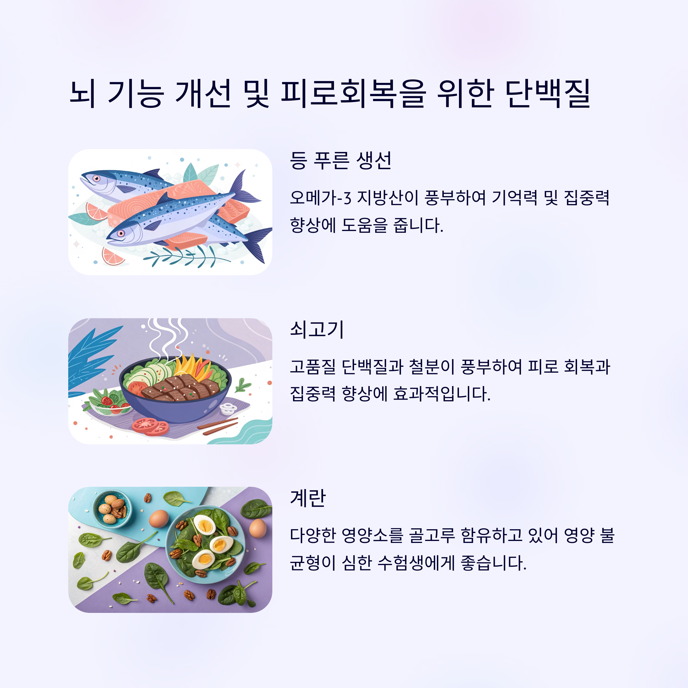 단백질은 근육과 뇌세포 구성의 필수 요소이며, 오메가-3 지방산은 뇌 기능 개선과 집중력 향상에 중요한 역할을 합니다.