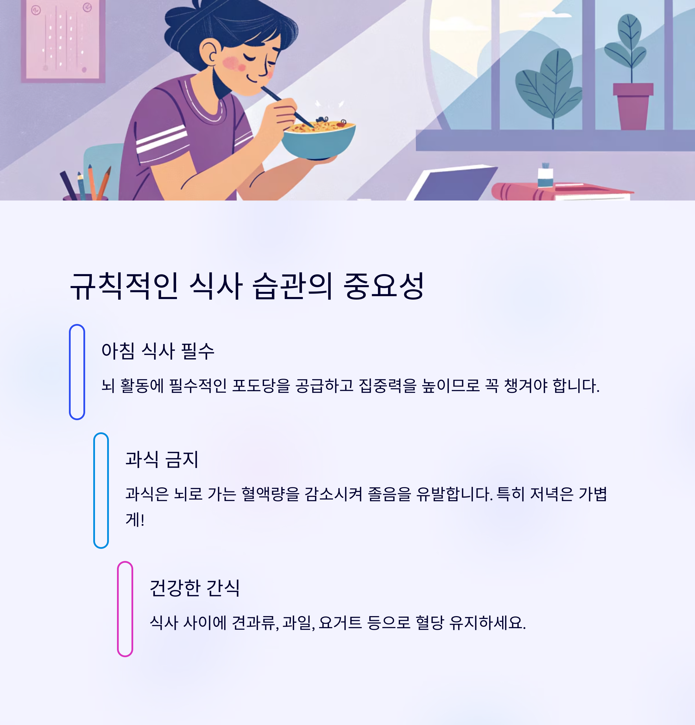 - 아침 식사: 뇌 활동에 필수적인 포도당을 공급하고 집중력을 높이므로, 아무리 바빠도 아침 식사는 꼭 챙겨야 합니다. 가볍게 통곡물 시리얼, 과일, 우유 등으로 구성해도 좋습니다.