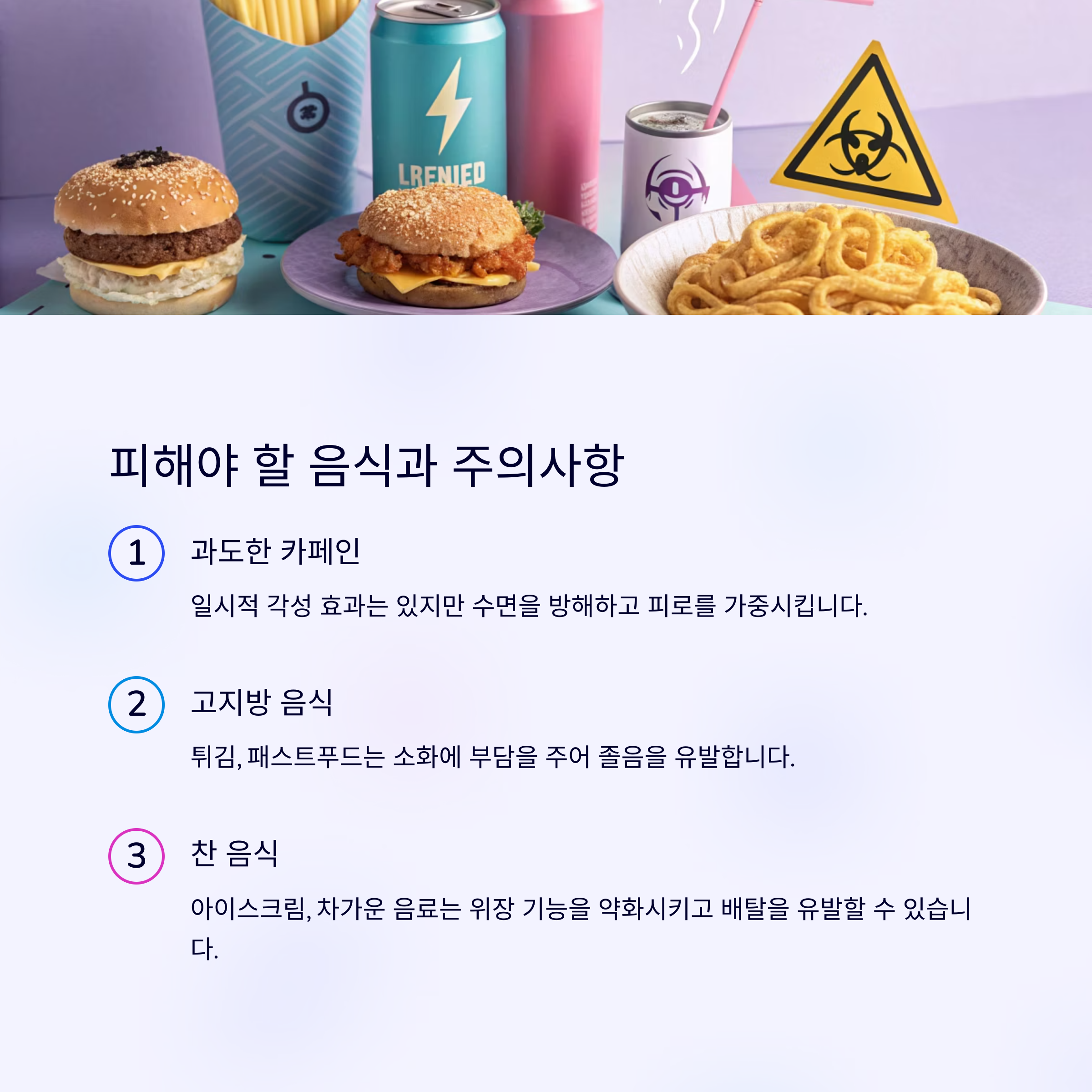 - 고열량, 고지방 음식: 튀김, 패스트푸드, 라면 등은 소화에 부담을 주어 졸음을 유발하고, 영양 불균형을 초래할 수 있습니다.