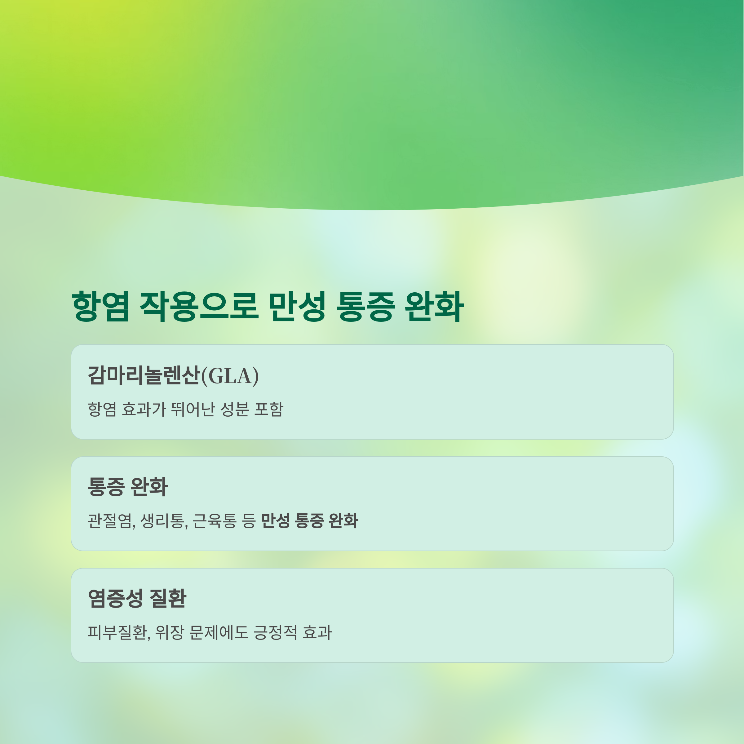 GLA는 관절염, 생리통, 근육통 등의 만성 통증을 완화하는 데 도움을 줍니다