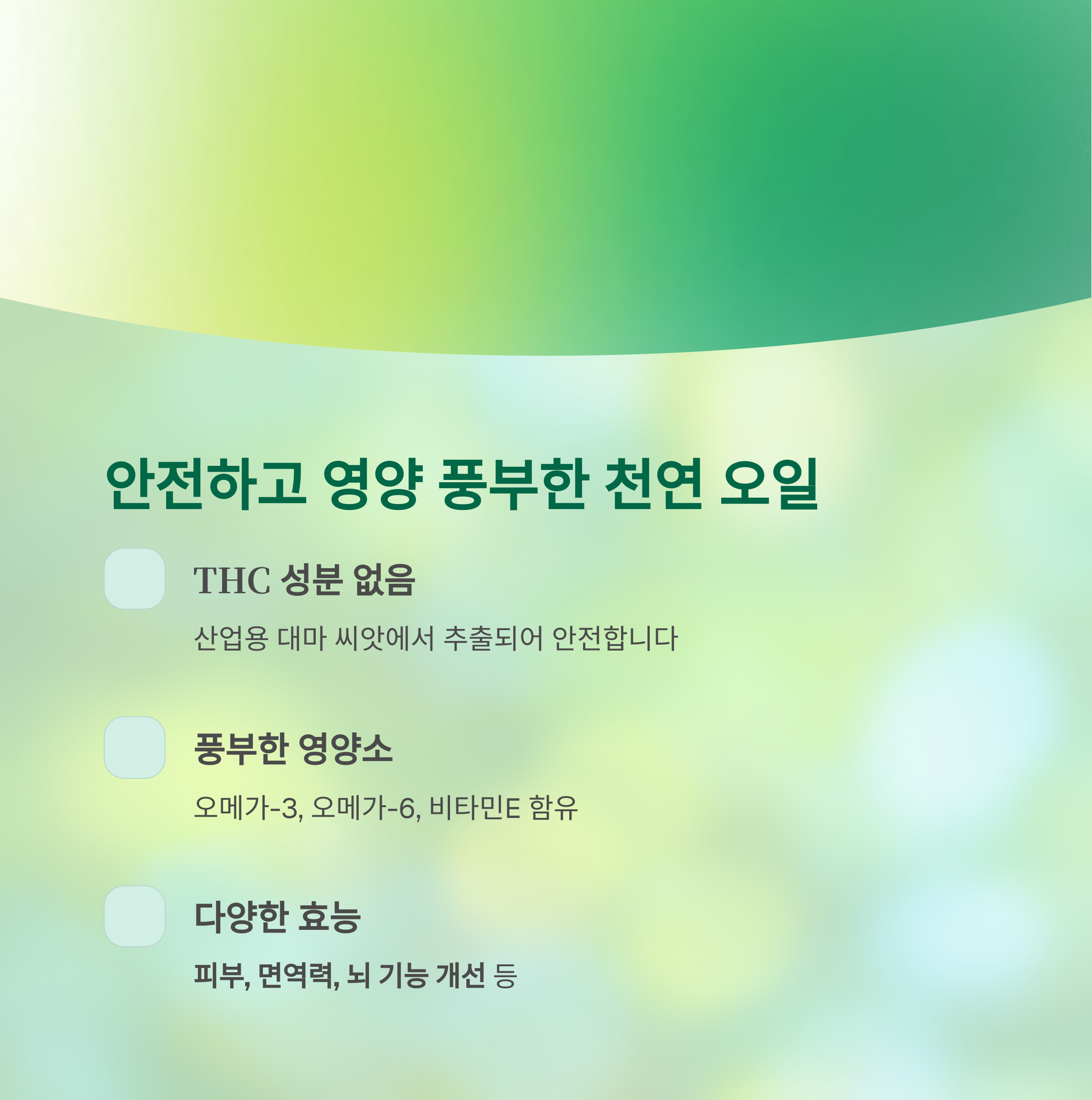 대마종자유는 산업용 대마의 씨앗에서 추출되며, THC 성분이 없어 안전합니다