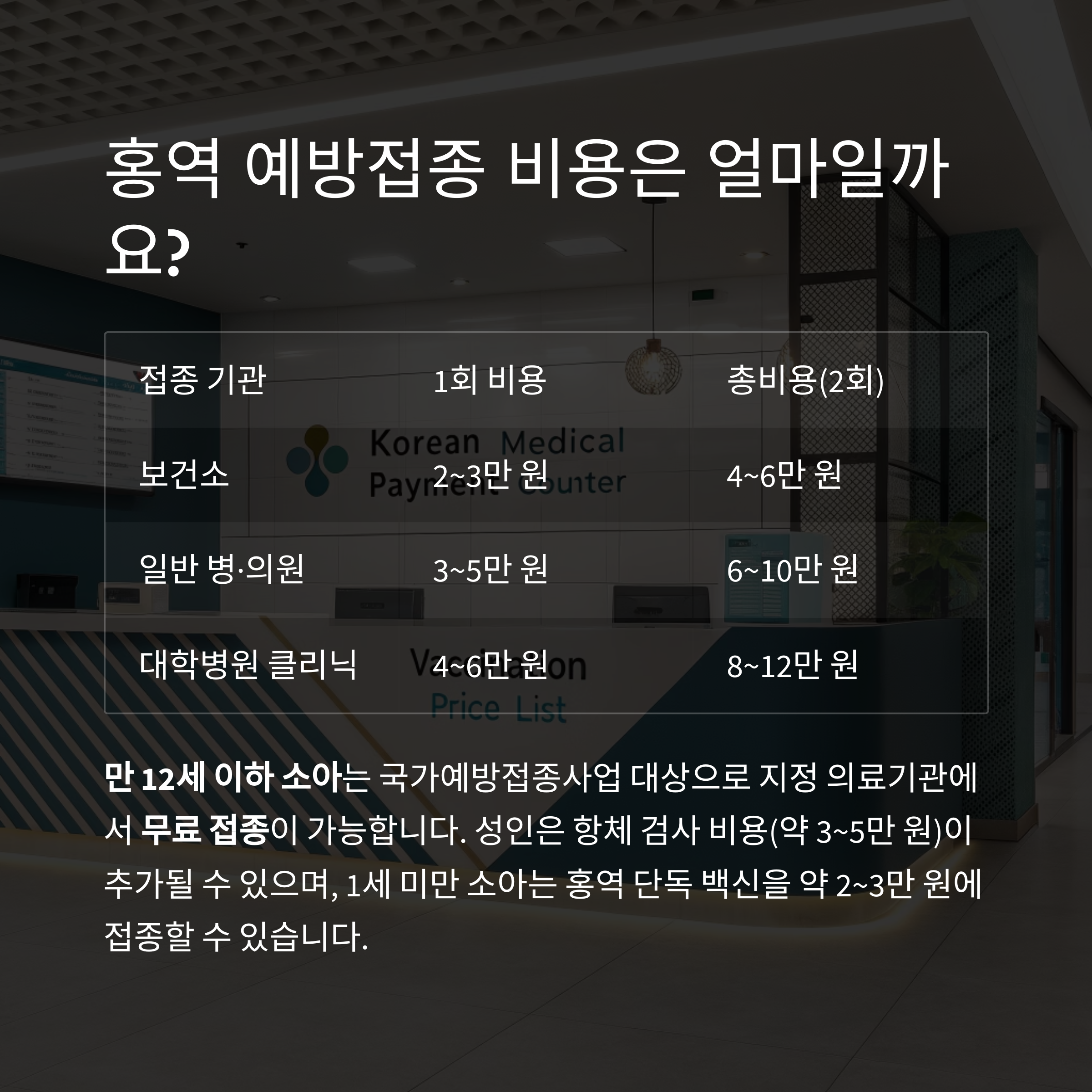 비용은 접종 기관 및 항체 검사 여부에 따라 4~12만 원 선에서 발생하며, 지정의료기관을 이용하면 무료 또는 저렴하게 예방접종을 받을 수 있습니다.