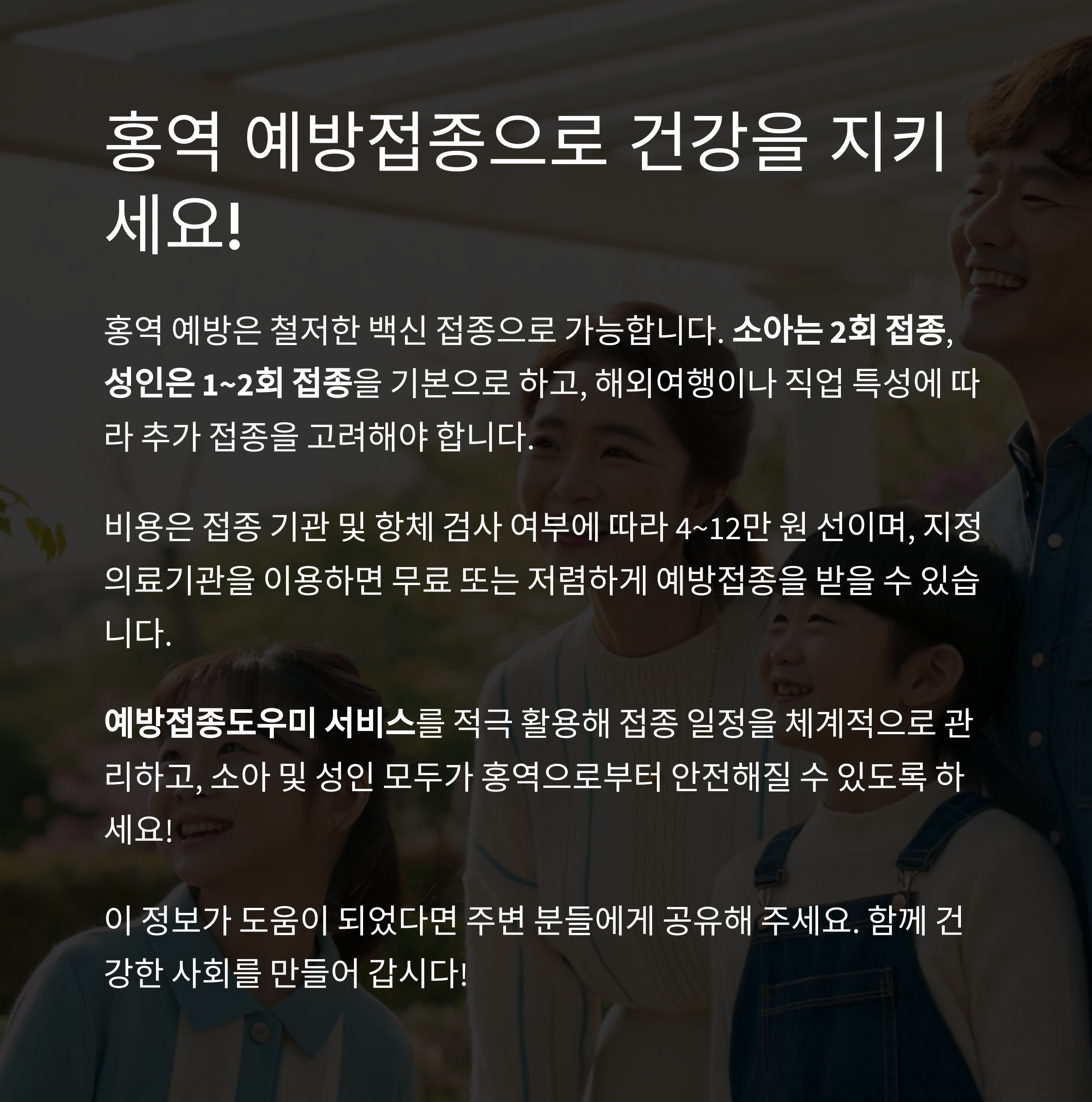 예방접종도우미 서비스를 적극 활용해 접종 일정을 체계적으로 관리하고, 소아 및 성인 모두가 홍역으로부터 안전해질 수 있도록 예방하는 것이 중요합니다.