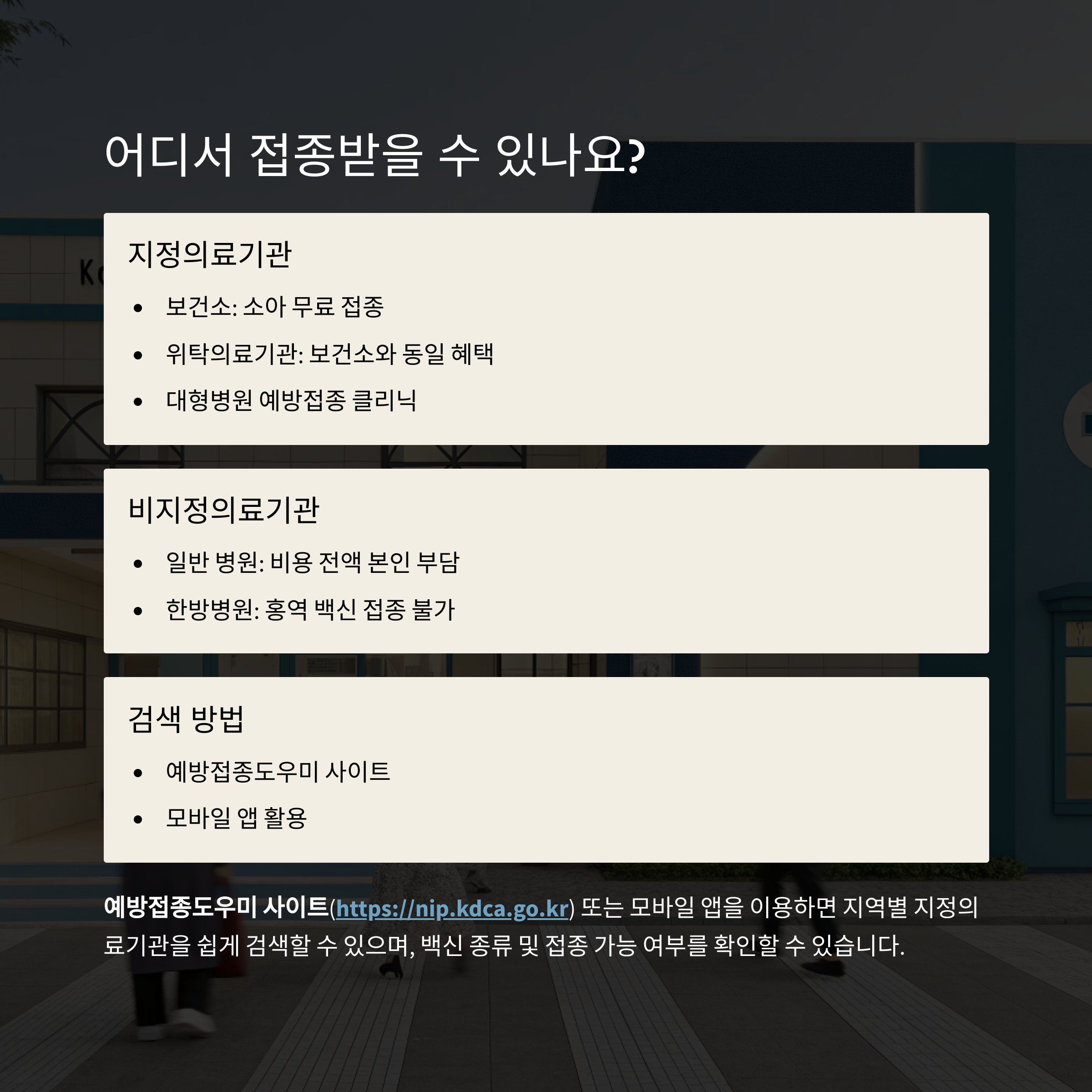 • 대형병원 예방접종 클리닉: 전문적인 백신 관리, 다만 비용은 다소 높을 수 있음