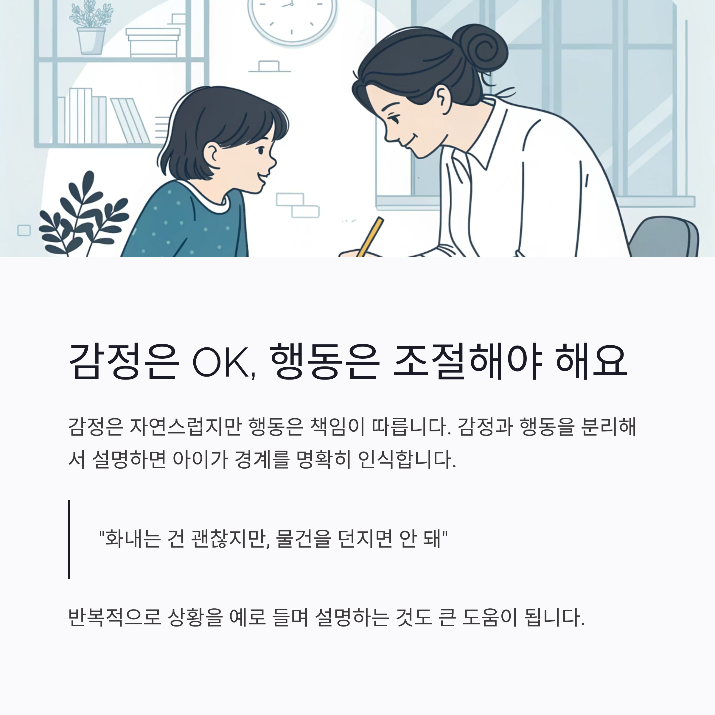 이처럼 감정과 행동을 분리해서 설명하면, 아이는 경계를 명확히 인식합니다.