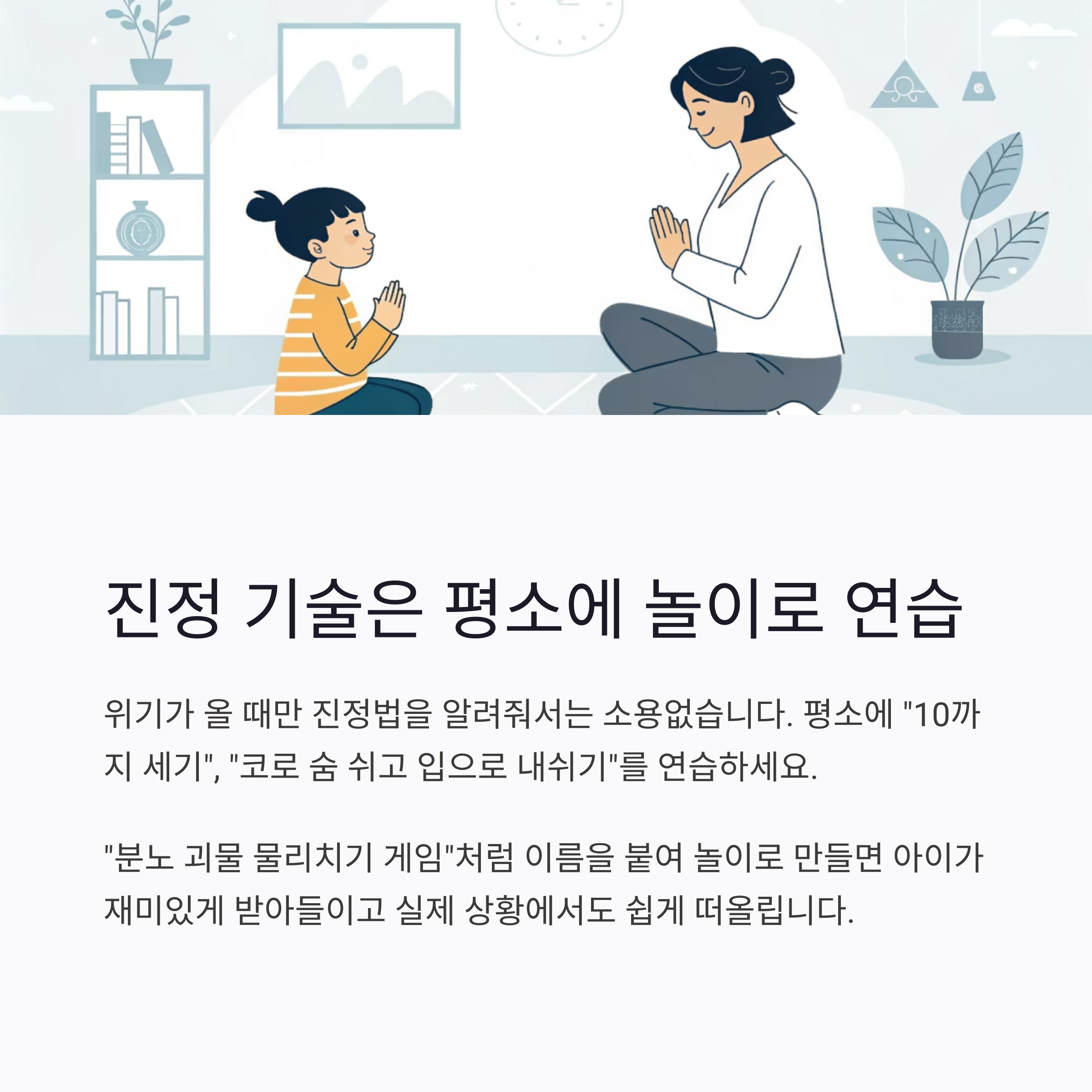 평소에 놀이처럼 "10까지 세기", "코로 숨 쉬고 입으로 내쉬기" 등을 연습하세요.