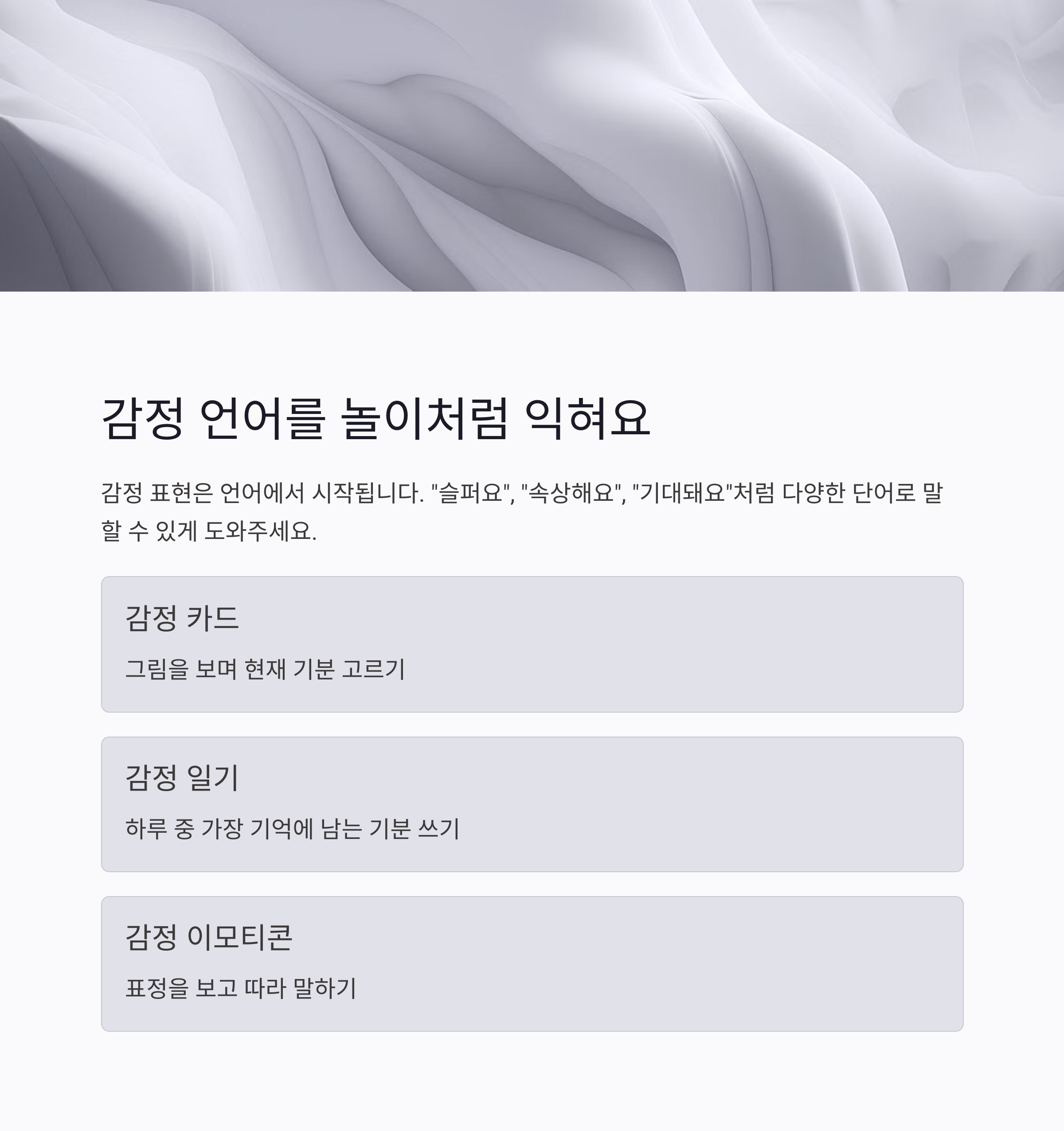 감정 카드를 사용하거나, 매일 저녁 "오늘 어떤 기분이었어?"라고 묻는 것만으로도