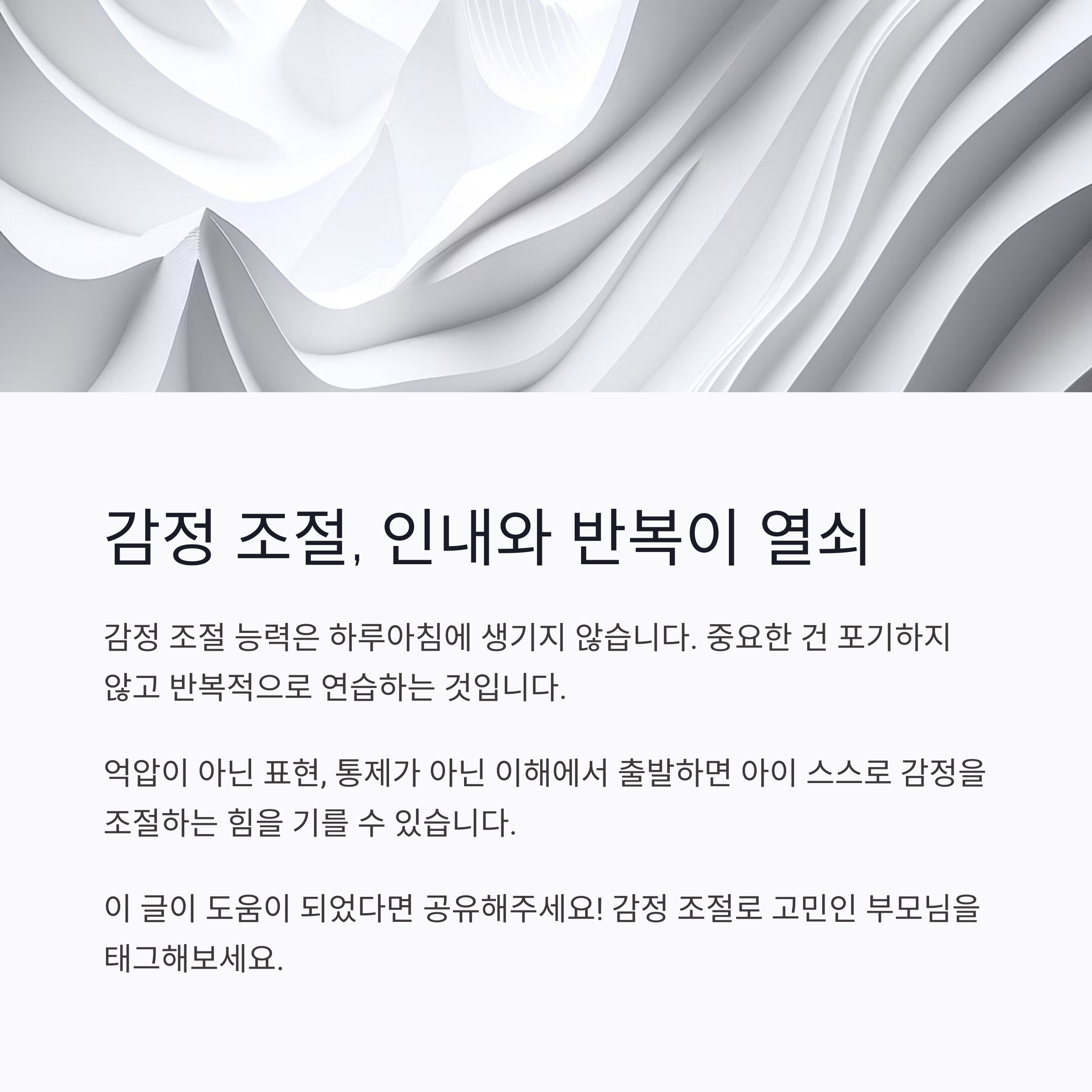 아이의 감정은 훈육보다 공감이 먼저입니다. 공감으로 마음을 열고, 조절법은 놀이처럼 익히는 것이 핵심입니다