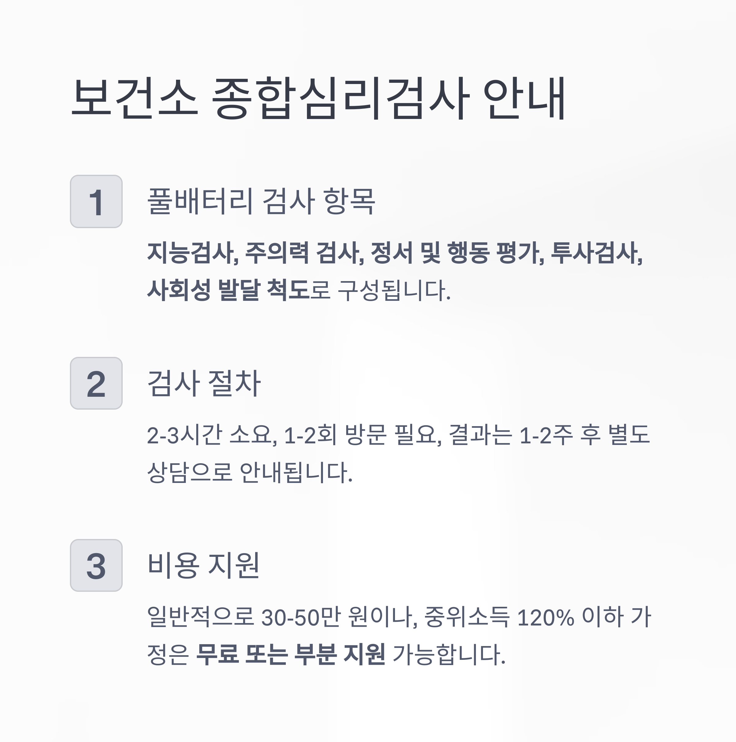 보건소에서는 다음 항목으로 구성된 풀배터리(종합심리) 검사를 제공합니다:
