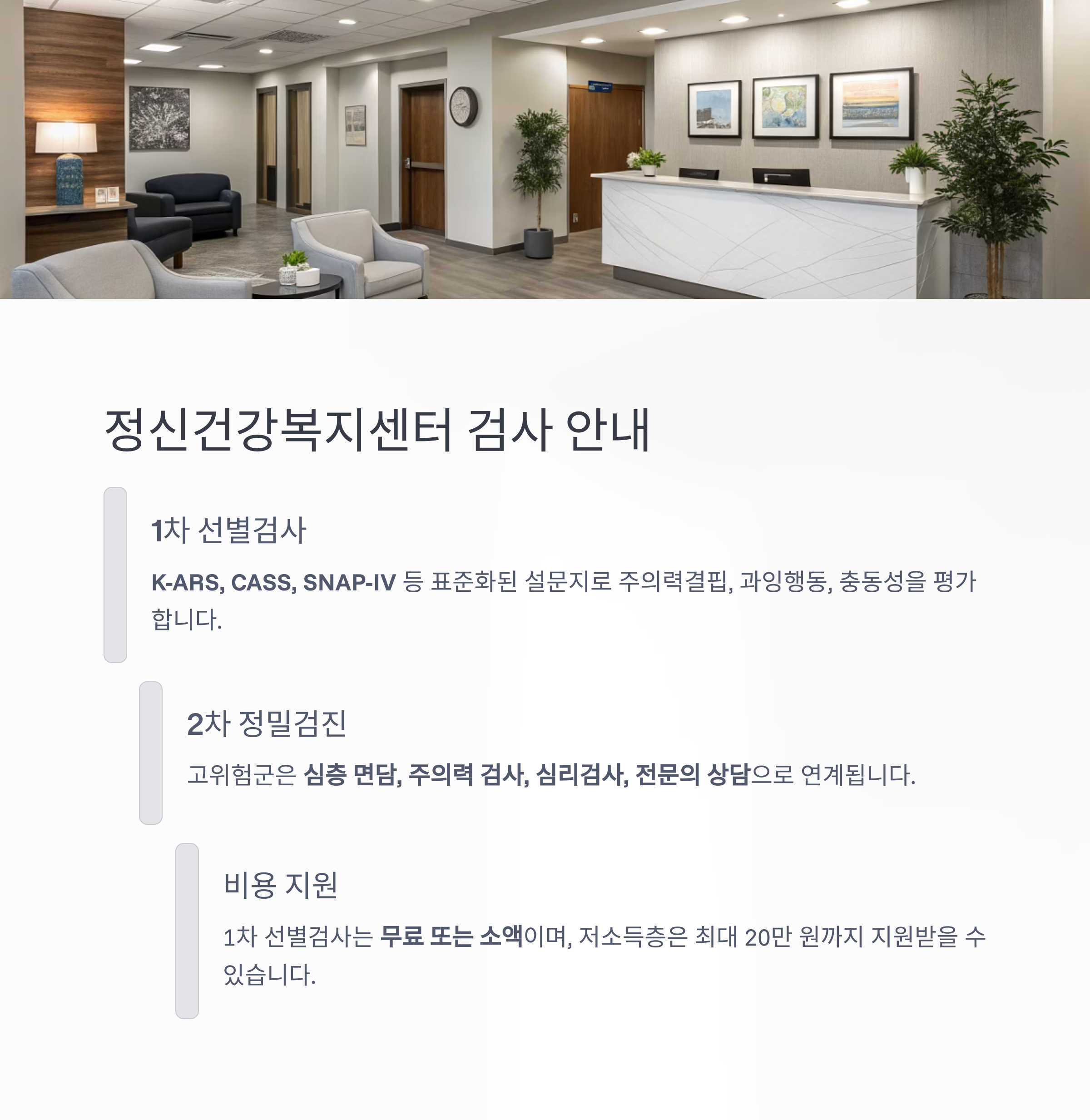 - 1차 검사에서 고위험군으로 분류되면 심층 면담, 주의력 검사(CAT, TOVA 등), 심리검사, 전문의 상담으로 이어집니다.