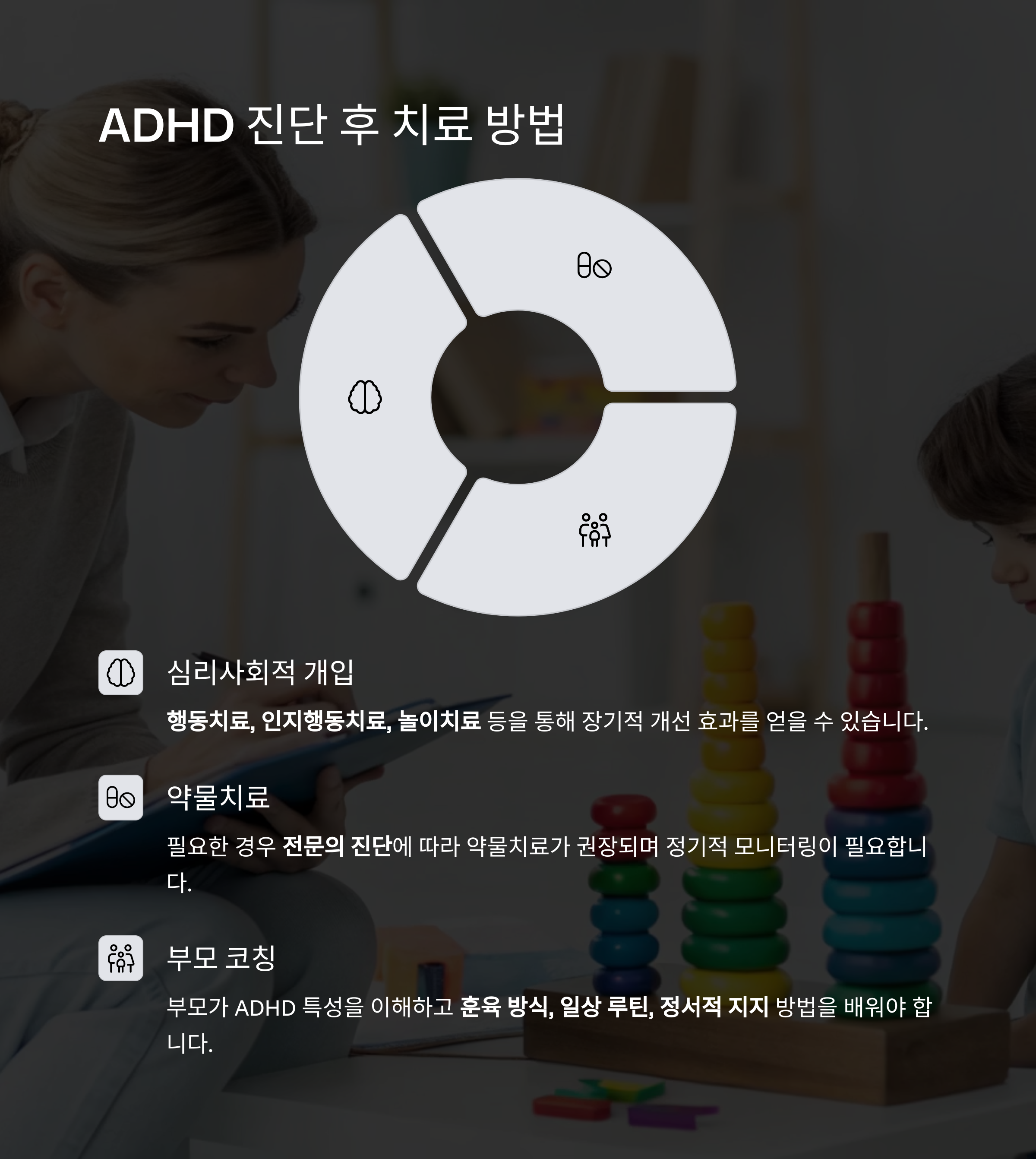 - 치료의 핵심은 단순한 약물복용이 아닙니다. ADHD 아동은 행동치료, 인지행동치료, 놀이치료 등을 병행해야 장기적인 개선 효과가 있습니다.