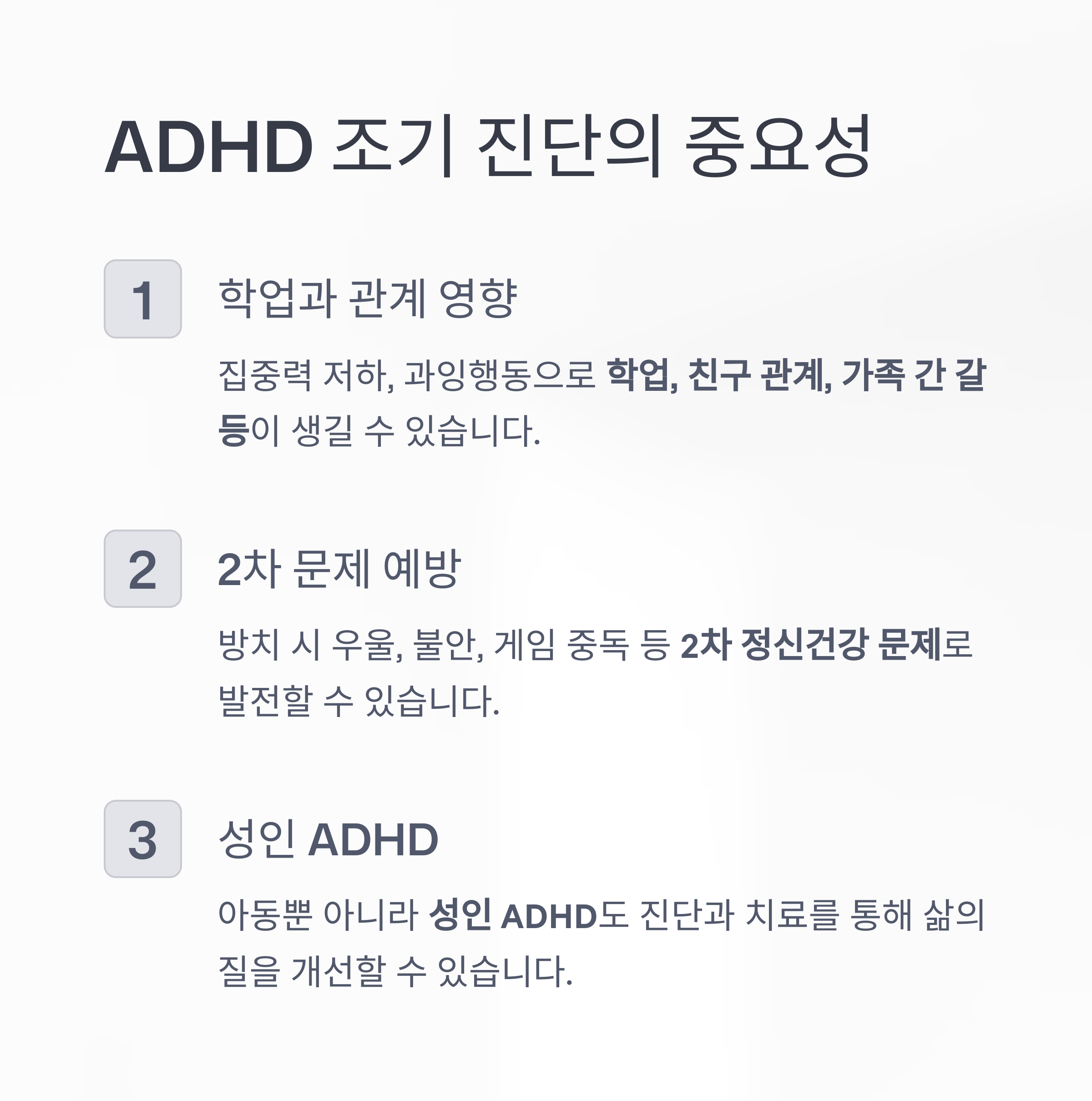 ADHD는 단순히 공부를 못하거나 산만한 것이 아닙니다. 집중력 저하, 과잉행동, 충동조절 문제 등으로 학업, 친구 관계, 가족 간 갈등에 영향을 줄 수 있으며, 방치 시 우울, 불안, 게임 중독 등 2차 정신건강 문제로 발전할 수 있습니다.